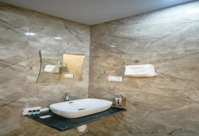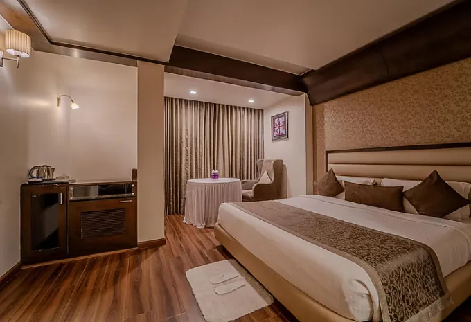 Relax in the Deluxe Room at Hotel Aditya Park Regent — the well‑appointed 224 sq ft (21 sq m) space features a plush double bed, private bathroom, air‑conditioning and daily housekeeping. Guests can unwind with in‑room Wi‑Fi, TV, mineral water and an electronic safe. Smart furnishings and soft lighting create a calm ambiance — perfect for couples or business travellers seeking a restful stay in the heart of Jaipur.