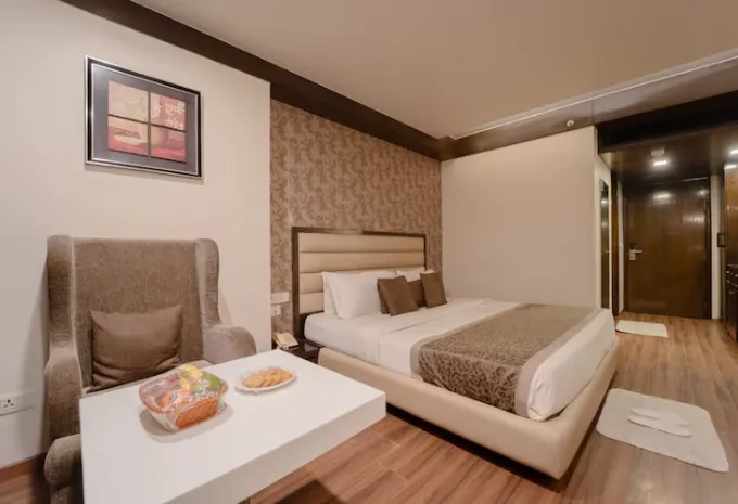 Relax in the Deluxe Room at Hotel Aditya Park Regent — the well‑appointed 224 sq ft (21 sq m) space features a plush double bed, private bathroom, air‑conditioning and daily housekeeping. Guests can unwind with in‑room Wi‑Fi, TV, mineral water and an electronic safe. Smart furnishings and soft lighting create a calm ambiance — perfect for couples or business travellers seeking a restful stay in the heart of Jaipur.